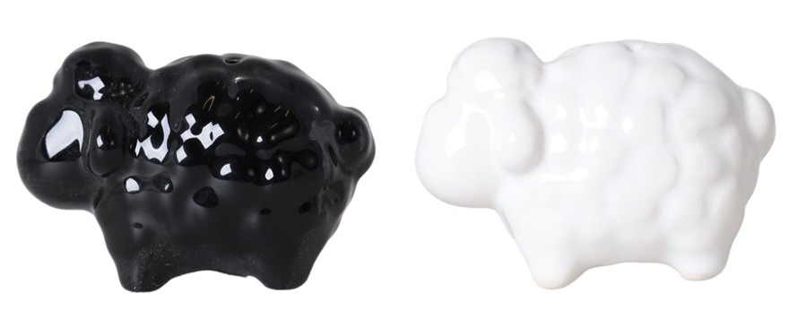 Ceramiczne figurki owieczek w kolorze białym i czarnym. Pełnią funkcję solniczki i pieprzniczki. Od spodu posiadają silikonową zatyczkę.Cena dotyczny 1szt. Kolor wysyłany losowo.Wymiary: 6x3,5x4,5 cm